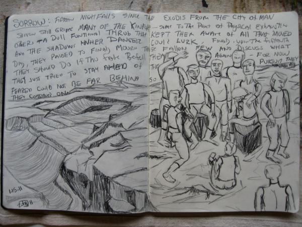 Fifteen night-falls since the exodus from the city of man, sorrow still crippled many of the kinsfolk. Some to the point of physical exhaustion and others, experiencing a dull, functional throb that kept them aware of all that moved and of the shadows where danger could lurk. Now, upon this fifteenth day, the paused to mourn these fallen few and discuss what they should do if this fate should ever befall them again. For now they just tried to stay ahead of the pursuit they feared could not be far behind, so they continued on, desperate for a respite.