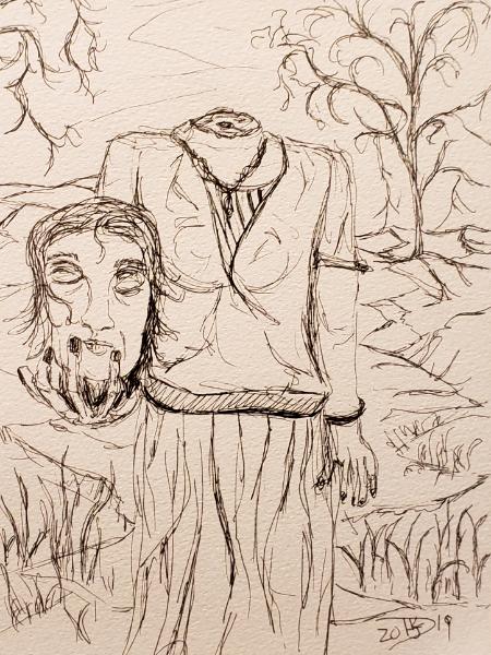 | | Having lost her head, she was unsure what she should do next. $100 Having lost her head, she was unsure what she should do next. © 2019 By Duane Kirby Jensen 5 1/2 × 7 1/2 sketch on watercolor paper. Be the first to post a comment.