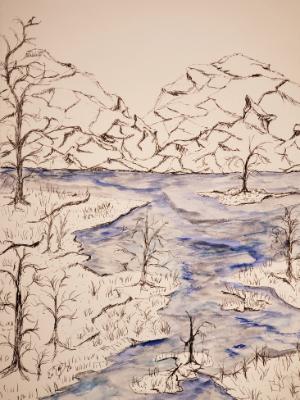 A slow moving river brings coolness to parched throats. © 2020 By Duane Kirby Jensen, 5 x 7 ink wipe on yupo medium $135