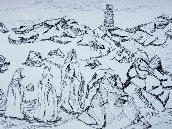 Seeking a quiet place to mediate. © 2021 By Duane Kirby Jensen, 6.5 x 9 ink sketch on watercolor paper. |