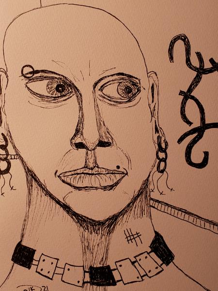 Standing away from the party goers, listening to them gossip about her. © 2021 By Duane Kirby Jensen, 6.5 x 9 ink sketch on wate |